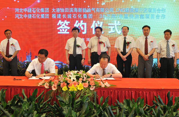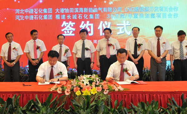 當(dāng)天簽約的兩個(gè)項(xiàng)目分別是中捷石化集團(tuán)與大港油田濱海新能油氣有限公司LNG新能源開(kāi)發(fā)項(xiàng)目合作協(xié)議、中捷石化與福建長(zhǎng)城石化集團(tuán)有限公司30萬(wàn)噸/年蒽油加氫項(xiàng)目合作協(xié)議。