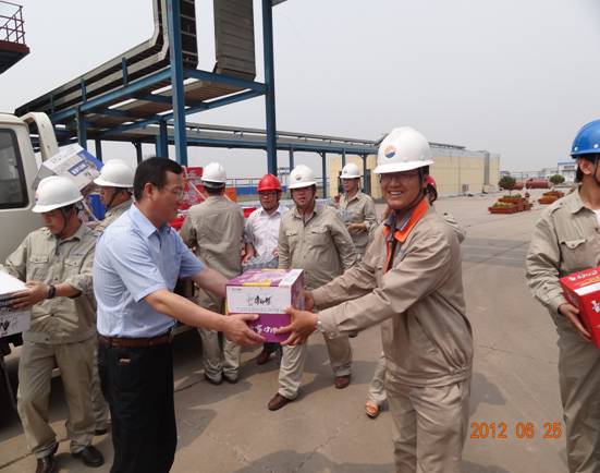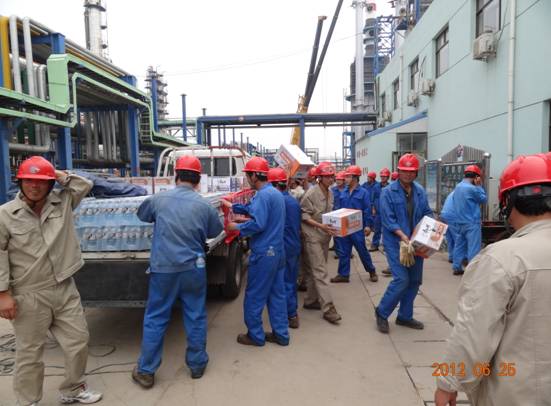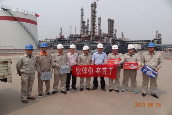 為表達集團公司對一線檢修員工的關愛,6月25日上午,總經理于國臣等集團領導來到中海石油中捷石化有限公司(合營公司)和新啟元公司檢修現場進行了慰問,并為他們送去了礦泉水和方便面。希望大家在檢修期間繼續發揚“不怕吃苦、任勞任怨、無私奉獻”的精神,在確保安全的基礎上,能夠按時保質保量的完成檢修任務。