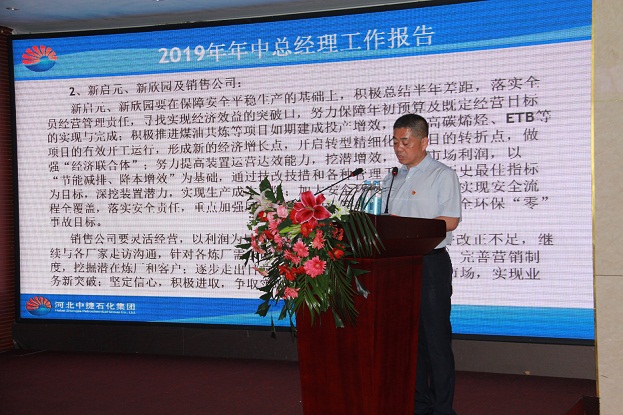 7月16日上午9:30,河北中捷石化集團在華悅凱旋大酒店4樓宴廳隆重召開建廠44周年暨2019年上半年工作會議,集團公司董事長王振華、總經理喬樹華等集團領導及各級管理人員共計74人參加會議,整個大廳座無虛席。大會由集團公司黨委書記于國臣同志主持。