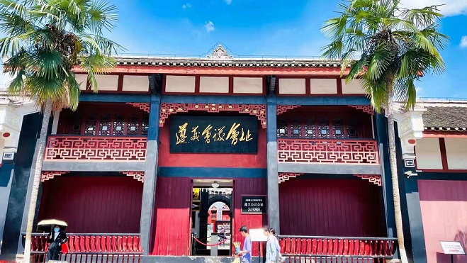 駐足遵義會議紀念館,首先映入大家眼簾的是紀念館門前大門正上方掛著的一塊黑漆金匾,上面有毛主席親自題寫的“遵義會議會址”6個金光閃閃的大字,字跡飄逸豪放。遵義會議紀念館的展廳內展示了大量文物、珍貴歷史圖片、文獻資料等,生動地再現(xiàn)了紅軍長征的歷程。“長征精神誨育千秋,遵義會議永放光芒。”遵義會議集中體現(xiàn)了堅定信念、實事求是、獨立自主、敢創(chuàng)新路、民主團結的精神。