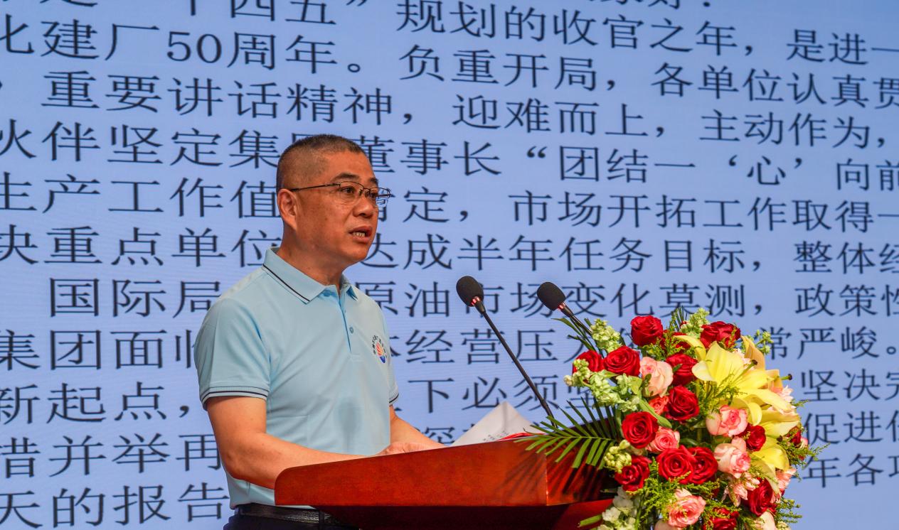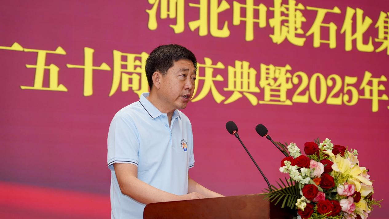 在熱烈的掌聲中,集團董事長王振華發表講話。董事長立足建廠五十周年的發展新起點,以《砥礪奮進五十載 繼往開來譜新篇》為題,深刻洞察時代變局,精準擘畫未來航程。他明確指出,面向未來,我們要“堅持創新驅動,打造核心競爭力;深化精益管理,提升運營效能;拓展市場空間,構建發展新格局;堅持以人為本,共建幸福家園;踐行社會責任,彰顯企業擔當。”同時,董事長以“篳路藍縷、櫛風沐雨、臥薪嘗膽、懸梁刺股”總結凝練了中捷石化五十年艱苦卓絕的奮斗歷程,并以此為精神內核,提出了面向未來的發展要求。