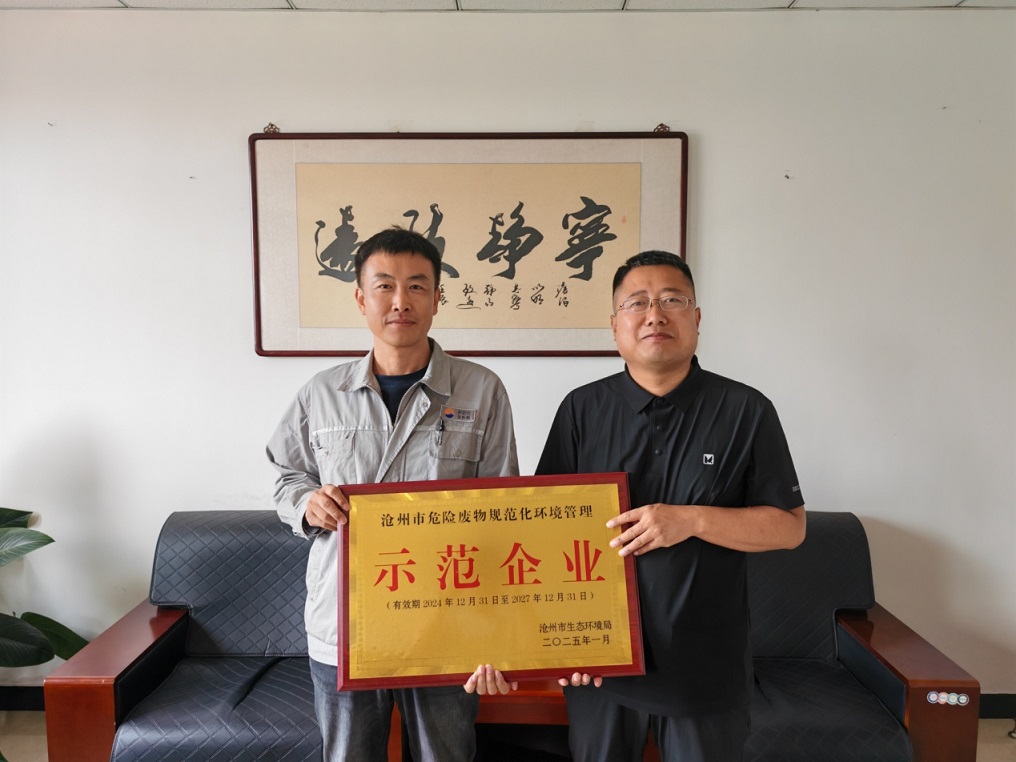 新啟元公司安全管理部訊 7月23日上午,中捷生態環境分局副局長劉樂將全區唯一獲得“滄州市危險廢物規范化環境管理示范企業”的獎牌及證書送到新啟元公司,此榮譽標志著公司的環境管理工作得到了各級生態環境部門的認可,同時也說明公司危險廢物管理工作的合規合法規范嚴謹。