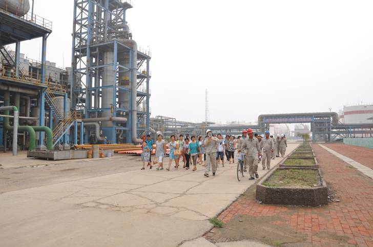2013年8月4日是公司各級管理人員家屬走進新啟元的日子,上午10:00員工家屬在綜合管理部人員的陪同下來到新啟元,與公司領導共同見證了蒽油反應器吊裝的過程,并由各部室負責人陪同員工家屬繞廠區參觀,對各裝置情況作了了解。