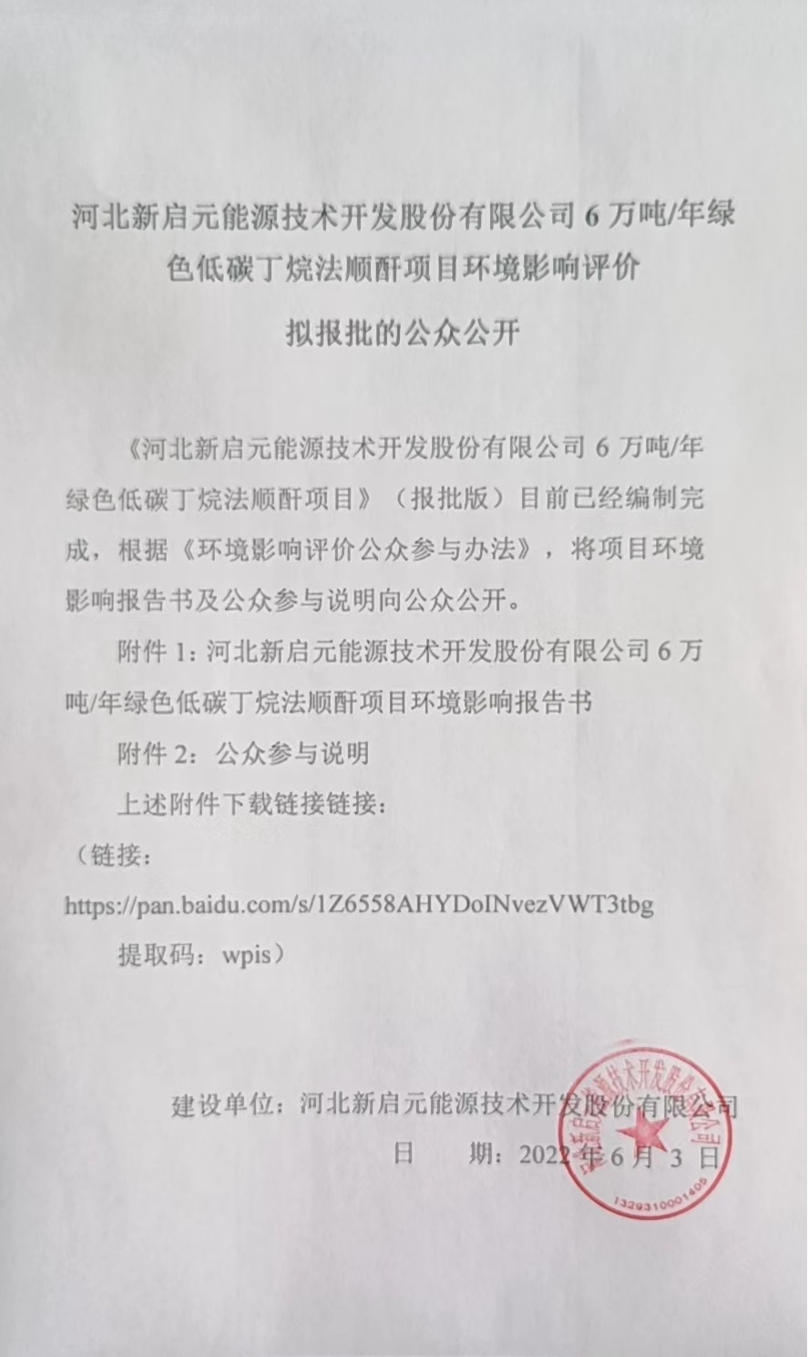 河北新啟元能源技術開發(fā)股份有限公司6萬噸/年綠色低碳丁烷法順酐項目環(huán)境影響評價擬報批的公眾公開